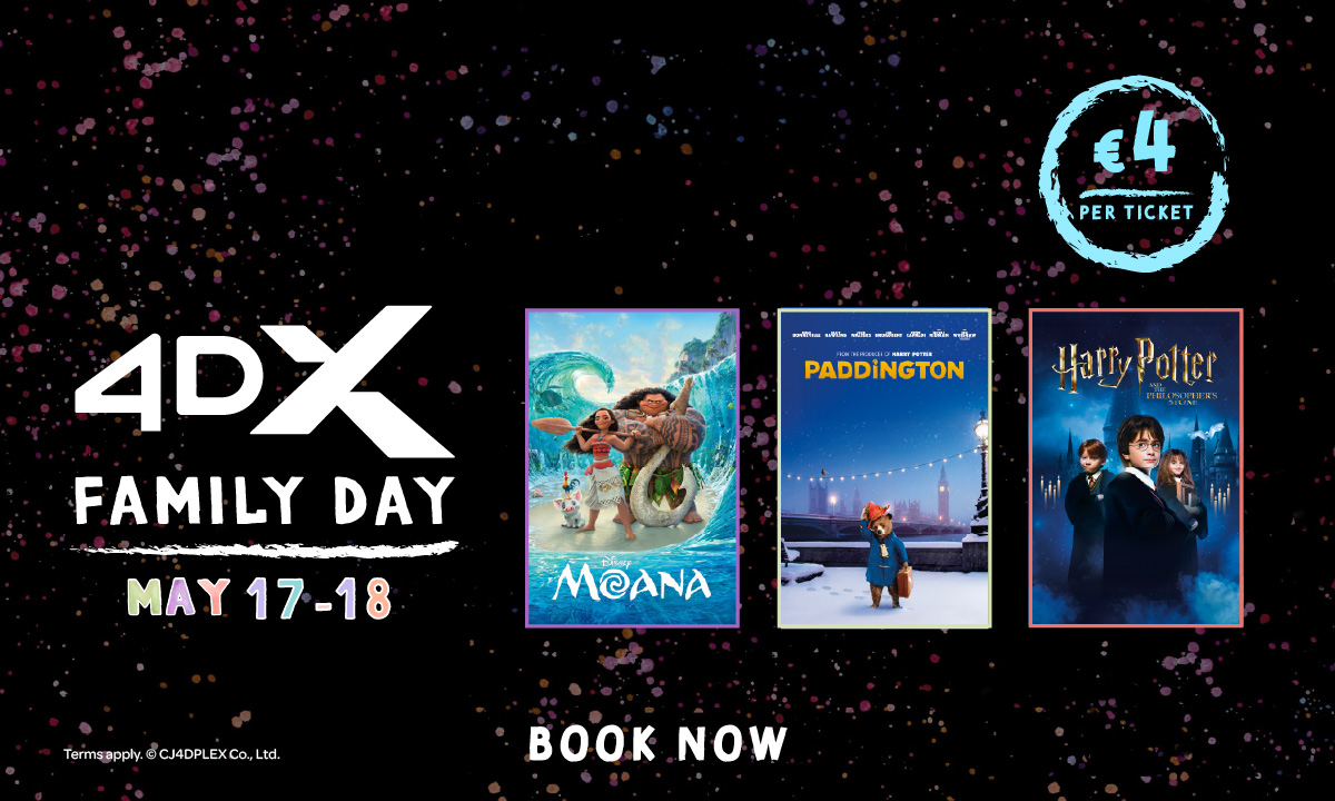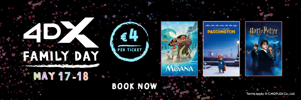 Offer only available on Saturday 17th and Sunday 18th May 2025. Online 4DX tickets €4 include booking fee, in-cinema tickets €4.50, Unlimited customers €3. Offer available in all Cineworld cinemas with a 4DX auditorium, whilst ticket availability lasts. Film line up subject to change. Not to be used in conjunction with any other offer. Click here for full offer terms. © CJ4DPLEX Co., Ltd. © 2016 Disney Enterprises Inc. A STUDIOCANAL RELEASE © 2014 STUDOCANAL S.A. TF1 FILMS PRODUCTION S.A.S. Paddington Bear™, Paddington™, and PB™ are trademarks of Paddington and Company Limited. TM & © 2025 WBEI PUBLISHING RIGHTS © J.K.R.