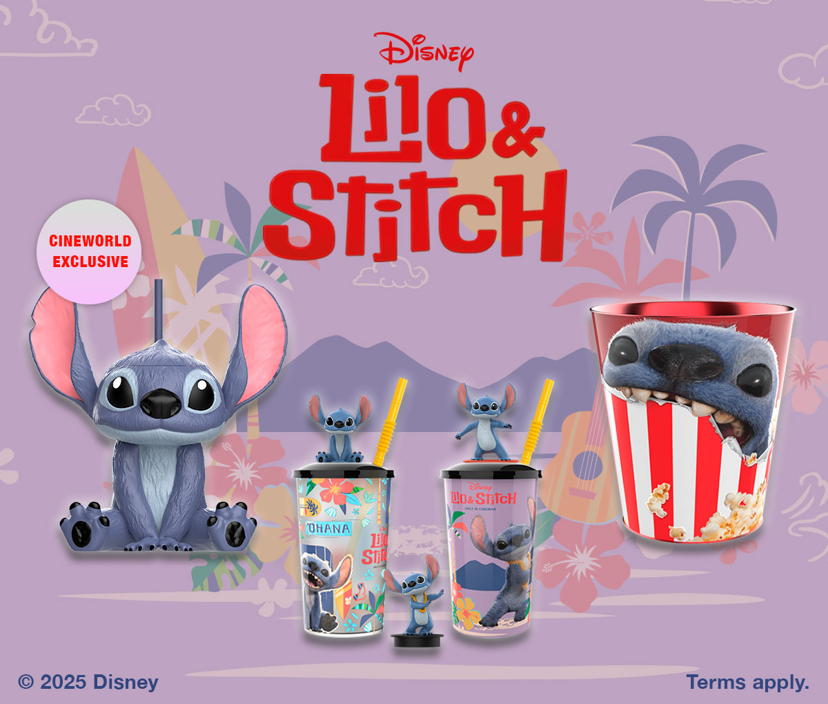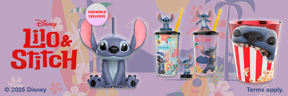 See Lilo & Stitch at Cineworld Cinemas and get your claws on our adorable selection of merch for a limited time only. Choose between our exclusive Stitch Bottle, our 2 Lilo & Stitch cups with 3 different toppers, and the Stitch Popcorn Bucket – OR collect them all!