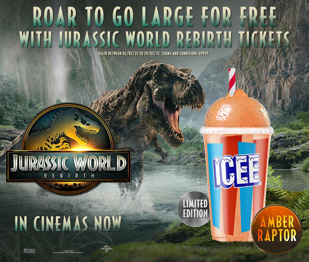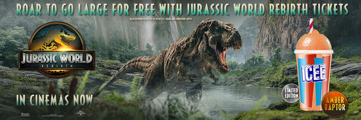 Upgrade your regular Amber Raptor ICEE to a large Amber Raptor ICEE when you ‘roar’ like a dinosaur to the staff member serving you at concessions on the date of your screening, with a valid Jurassic World Rebirth Ticket.