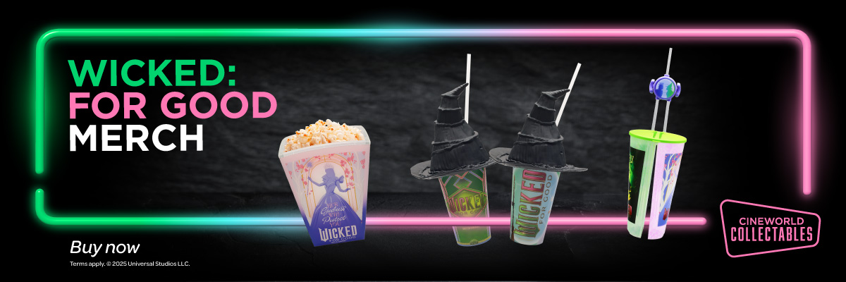 The offer includes 1 x Cineworld Exclusive (in UK & Ireland) Wicked: For Good Hat Lid Cup for β¬8.99 when purchased with any combo or Munchbox, or β¬10.99 on its own. 1 x Cineworld Exclusive (in UK & Ireland) Wicked: For Good Dual Chamber Cup for β¬16.99, including a Large ICEE. 1 x Cineworld Exclusive (in UK & Ireland) Wicked: For Good Double Wall LED Popcorn Bucket for β¬24.99, including a Large Popcorn and Large Carbonated Soft Drink.