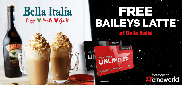 Simply head to your closest Bella Italia between now and 14th April, show your Cineworld Unlimited card and get free Baileys latte* with any purchase from the a la carte menu. You can also use your Unlimited card to get 25% off the cost of your bill.