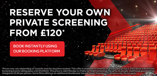 Prices may vary depending on location and the day/time booked. £120 price is for Private Screening events taking place until 04/09/22 at group 1 and group 2 cinemas. This price is valid Monday to Friday for 10am screenings for up to 20 people. Additional guests will be charged at £5.99 per person. £140 price is for Private Screening events taking place until 04/09/22 at group 3 cinemas. Additional guest will be charged at £6.99 per person. Cineworld Leicester Square is not included in the offer. Some films will incur an additional blockbuster fee per ticket. All quotes are valid for 14 days. Standard 2D screens only, premium formats such as IMAX, 4DX, ScreenX or Superscreen excluded. Private hires are subject to availability and only a limited number of screens are available to hire per cinema. Cineworld reserves the right to change or withdraw this offer at any time without notice. All bookings are subject to contract. Full terms available above.